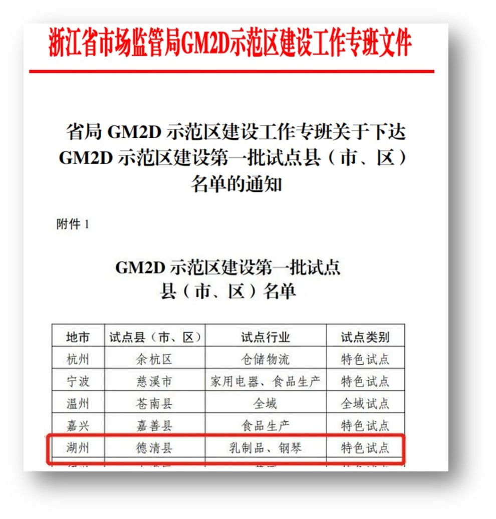 GS1决定确立浙江省为GM2D全球首个示范区,为全球二维码迁移计划实施的原点和首站。近日,浙江省市场监管局GM2D示范区建设第一批试点县(市、区)名单公布,其中,德清县乳制品行业入选。