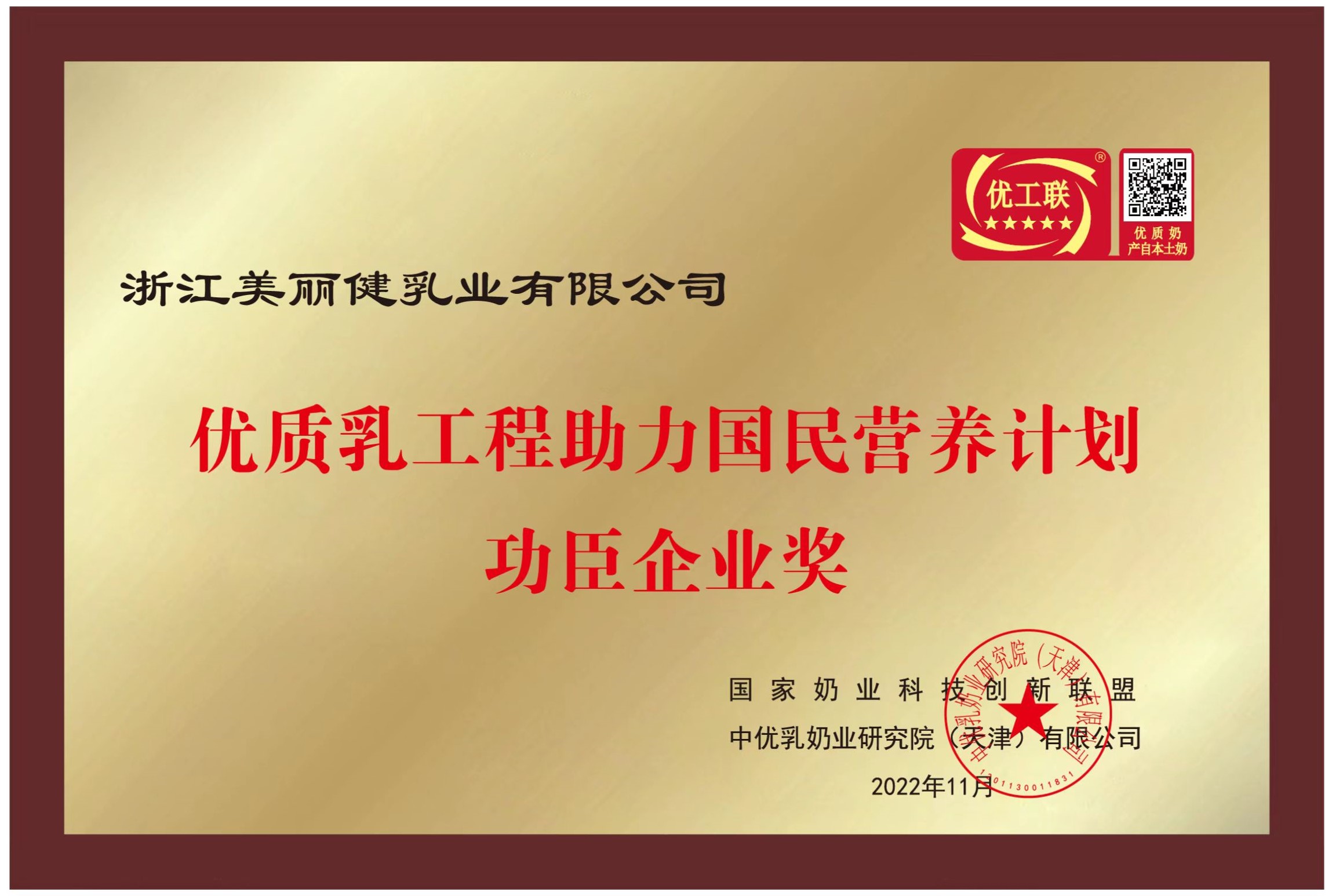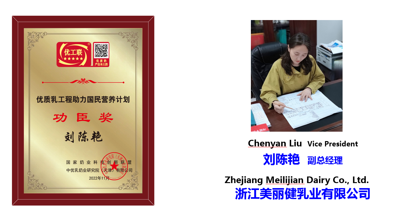 浙江美丽健乳业有限公司作为全国第39家通过优质乳工程验收的企业,先后经过抽检、评价、评审,产品品质稳定达到标准要求,获得“优质乳工程助力国民营养计划功臣企业奖”。同时,浙江美丽健乳业有限公司刘陈艳总经理获得“优质乳工程助力国民营养计划功臣奖”。