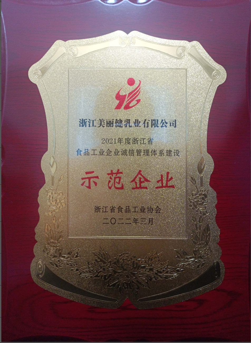 浙江美丽健乳业有限公司荣获由浙江省食品工业协会颁发的“2022年度浙江省食品工业企业诚信管理体系建设示范企业”;公司员工许季、闻株梅获评“2022 年度浙江省食品工业企业诚信管理体系建设积极分子”。