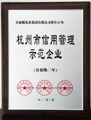 多年来,美丽健乳业坚持诚信经营,不断加强信用管理,提高质量效益,持续增强自我发展能力和综合竞争力,信誉度与美誉度不断提升,公司在企业经营、安全生产、产品质量、依法纳税、劳动保障等各领域全程保障,强化诚信支撑,企业信用管理取得显著成绩:2019、2022蝉联“杭州市信用管理示范企业”称号、2020、2021年度浙江省食品工业企业诚信管理体系建设示范企业。